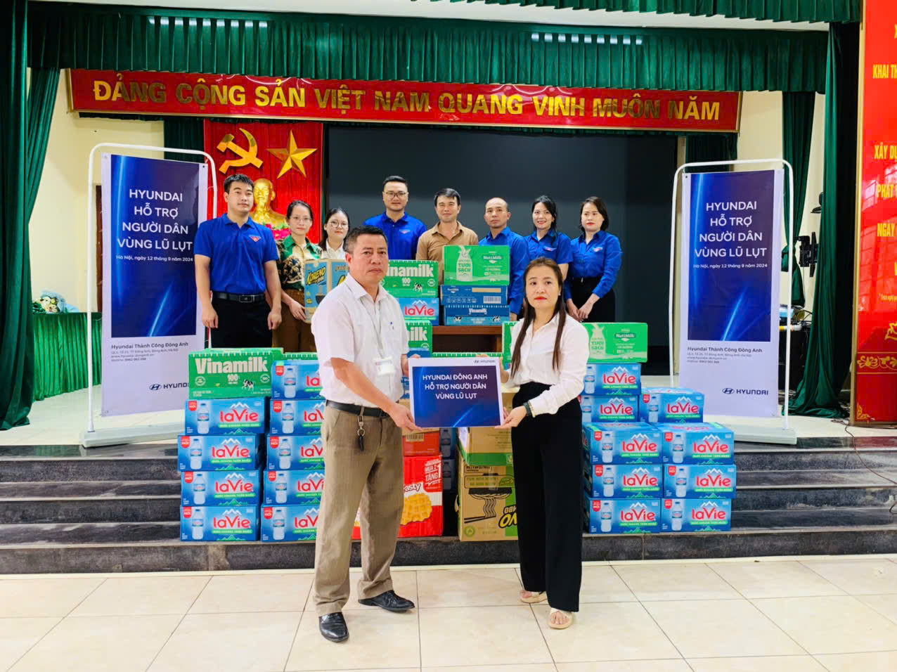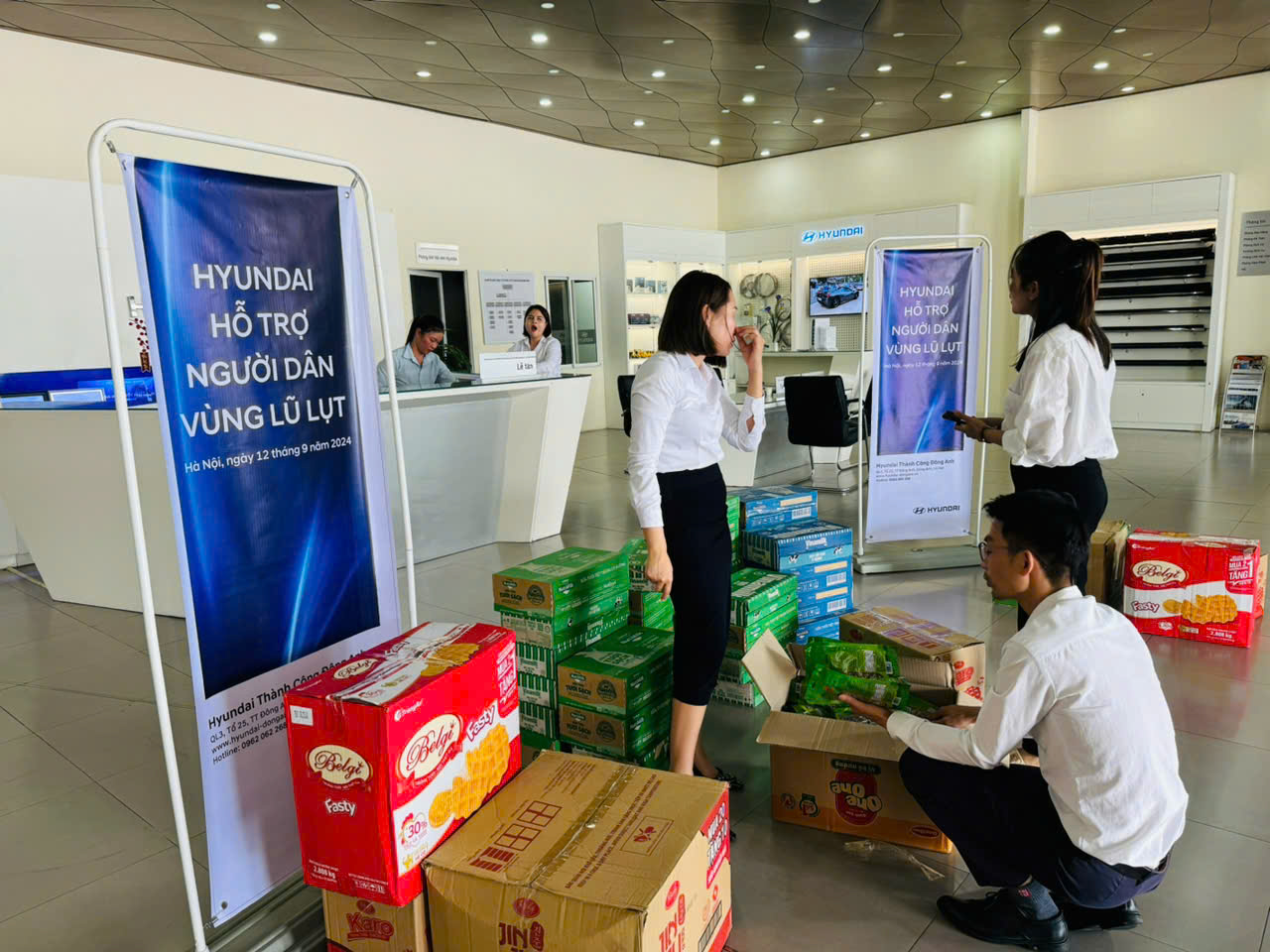 Tại địa bàn huyện Đông Anh trong lúc này vẫn xảy ra tình trạng ngập lụt ở một số khu vực, Hyundai Thành Công Đông Anh đã kịp thời phối hợp với Huyện đoàn cùng cán bộ các địa phương bị ảnh hưởng và có dân đang trong vùng ngập nước để hỗ trợ và cung cấp một số các nhu yếu phẩm.