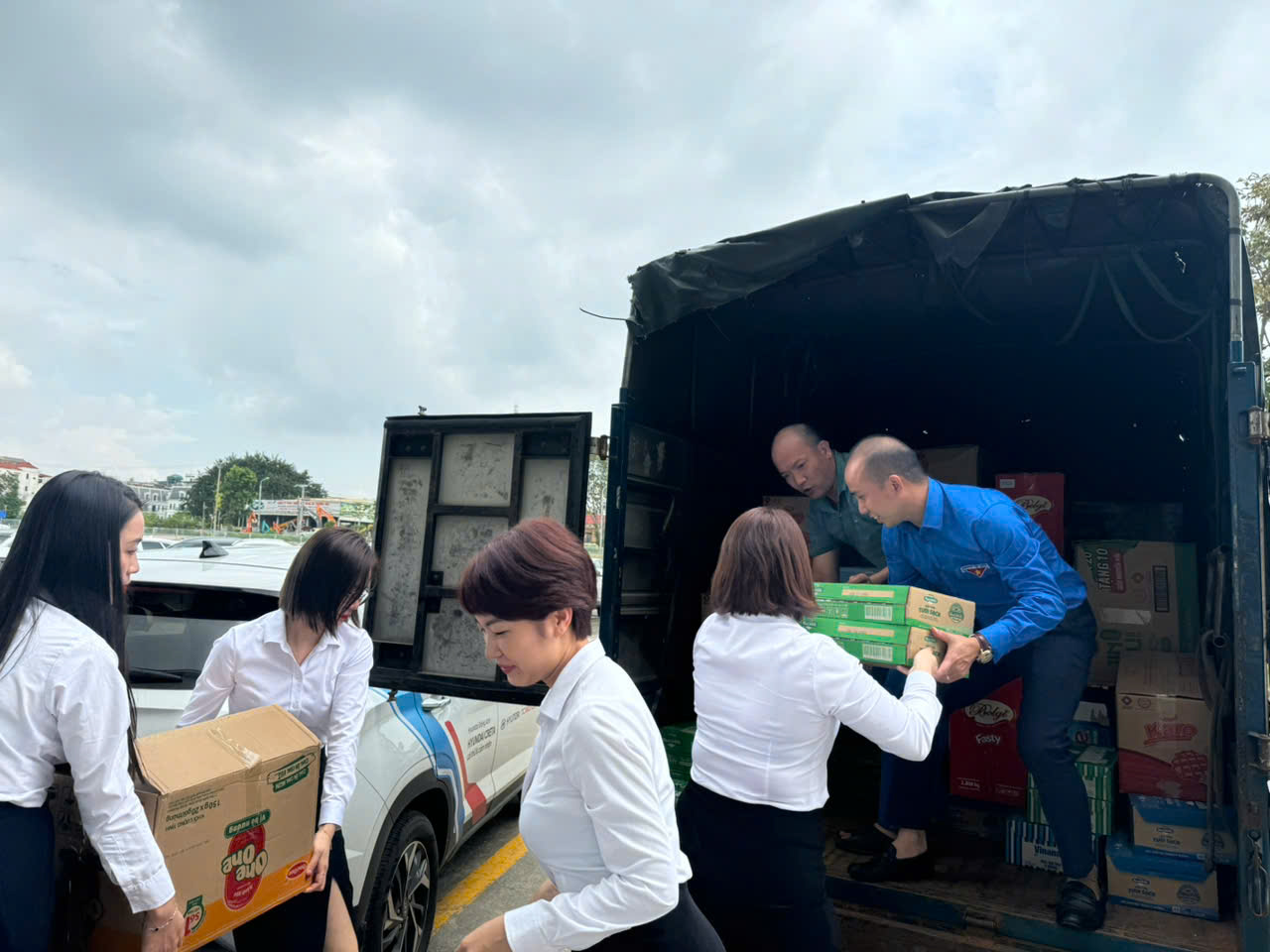 CB-NV Hyundai chuyển hàng lên xe chở đến bà con vùng bị ngập nước